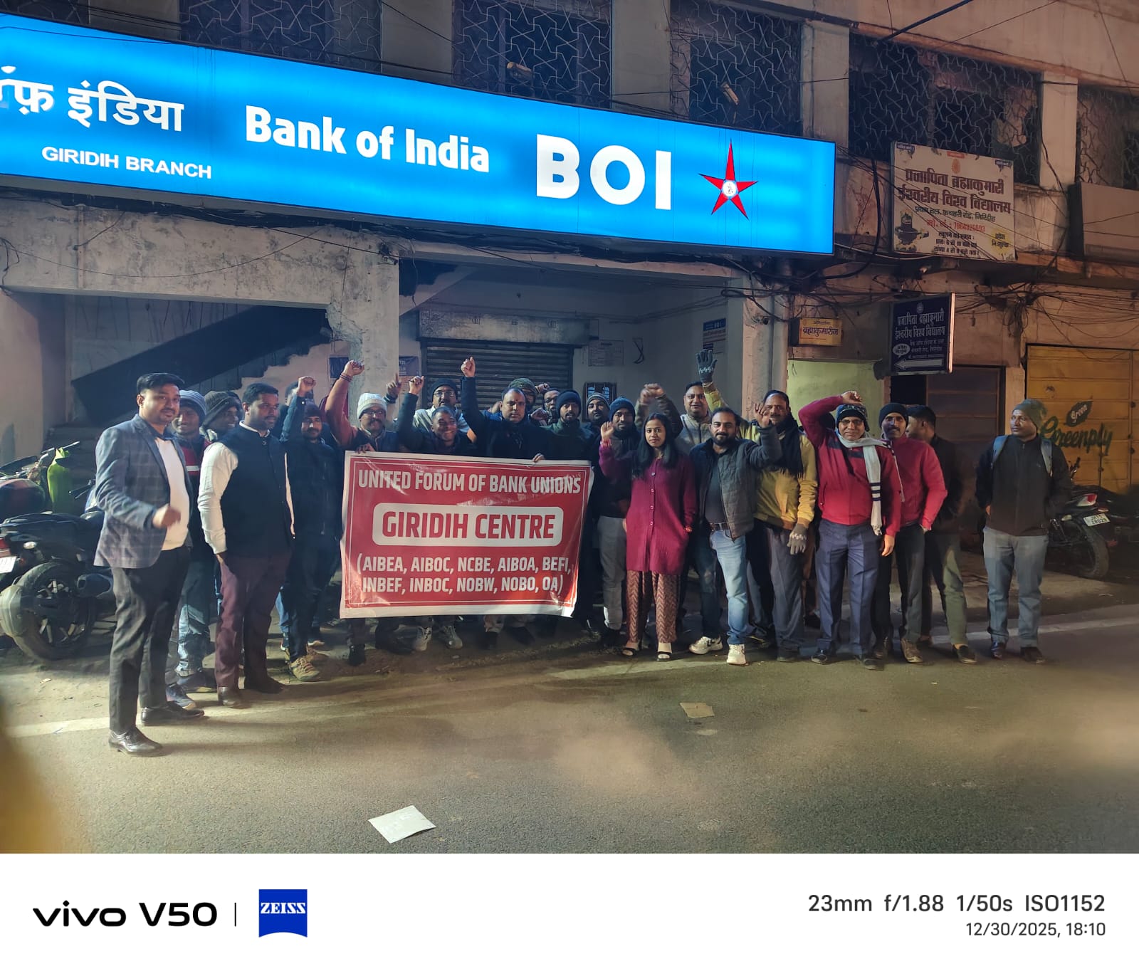 गिरिडीह. यूनाइटेड फॉर्म ऑफ बैंक यूनियंस के अहवान् पर बैंक कर्मचारी एवं अधिकारियों ने बैंक ऑफ इंडिया गिरिडीह मुख्य शाखा के समक्ष पांच दिवसीय बैंकिंग सप्ताह की मांग को लेकर जोरदार प्रदर्शन किया. इस प्रदर्शन में महिला बैंक कर्मियों की सहभागिता भी रही. बताया गया की पांच दिवसीय सप्ताह हमारे देश के अंतर्गत रिजर्व बैंक नाबार्ड, सेबी स्टॉक एक्सचेंज, बीमा (LIC-GIC-UINC-NIC-OIC) कॉरपोरेट सेक्टर बहुराष्ट्रीय कंपनियां, आईटी सेक्टर- टीसीएस इंफोसिस विप्रो आदि, सार्वजनिक क्षेत्र के ONGC, BPCL, सरकारी मंत्रालय, न्यायालय आदि में पांच दिवसीय साप्ताहिक सप्ताह का प्रावधान है. मात्र वाणिज्यिक बैंकों में इसका प्रावधान नहीं है. यह बैंक कर्मचारियों के साथ पूर्णता अनुचित है उनके स्वास्थ्य के साथ खिलवाड़ है. सबसे बड़ी बात तो यह है कि पांच दिवसीय बैंकिंग के संदर्भ में इंडियन बैंक एसोसिएशन के साथ युनाइटेड फोरम ऑफ बैंक यूनियन्स की आपसी सहमति एवं सुझाव के बावजूद भी आज – तक लागू नहीं किया जाना चिंता का विषय है. पिछले 20 महीना के बीच में लगभग 10-11 रिसिडूयल इशू पर वार्ता हुई लेकिन इंडियन बैंक एसोसिएशन का एकमात्र जवाब है कि मामला केंद्र सरकार के पास लंबित है. हम इस प्रदर्शन के माध्यम से पूरे केंद्र सरकार से मांग करते हैं कि हमारी न्यायिक मांगों को लेकर तत्काल निष्पादन करने की पहल करें अन्यथा आने वाले दिनों में और भी तीव्र आंदोलन होगा, यही हालत रही तो हम तमाम कर्मचारी और अधिकारी हड़ताल पर जाने के लिए बाध्य होंगे जिनकी पूरी जवाबदेही केंद्र सरकार की होगी. प्रदर्शन में पवन कुमार बरनवाल, दिलीप कुमार, दीपक कुमार, अभिषेक कुमार, देवराज आनंद, अजय कुमार, अंजली कुमारी, मेघा, कुंदन कुमार, सीताराम, विनीत विशाल, संध्या सिंह, शिवलाल मुर्मू, भारती हंसदा, आशीष कुमार, अर्जुन राम, वसीम अकरम अंसारी, ऋषि विवेक आदि शामिल थे.