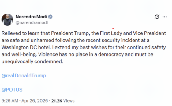 “यह जानकर राहत मिली कि राष्ट्रपति ट्रंप और उनका परिवार सुरक्षित है। मैं उनकी लंबी उम्र की कामना करता हूं। लोकतंत्र में हिंसा के लिए कोई स्थान नहीं है और ऐसी घटनाओं की जितनी निंदा की जाए कम है।”