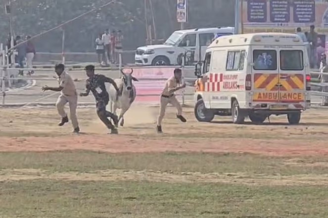बेगूसराय. मुख्यमंत्री नीतीश कुमार की ‘समृद्धि यात्रा’ के तीसरे चरण का आज अंतिम दिन है. आज मुख्यमंत्री बेगूसराय और शेखपुरा जिले के दौरे पर रहेंगे, जहां वे करोड़ों रुपये की विकास योजनाओं का शिलान्यास और उद्घाटन करेंगे. हालांकि, बेगूसराय पहुंचने से पहले ही वहां सुरक्षा व्यवस्था में बड़ी चूक सामने आई. सीएम के आगमन के लिए बनाए गए हेलीपैड पर अचानक एक आवारा बैल घुस गया. बैल ने वहां तैनात पुलिसकर्मियों को दौड़ा दिया, जिससे अफरा-तफरी मच गई. स्थिति यह थी कि अपनी जान बचाने के लिए पुलिस के जवान वहां खड़ी फायर ब्रिगेड की गाड़ी पर चढ़ गए. काफी मशक्कत के बाद एंबुलेंस और पुलिस वाहनों की मदद से बैल को घेरा गया और हेलीपैड से बाहर खदेड़ा गया.