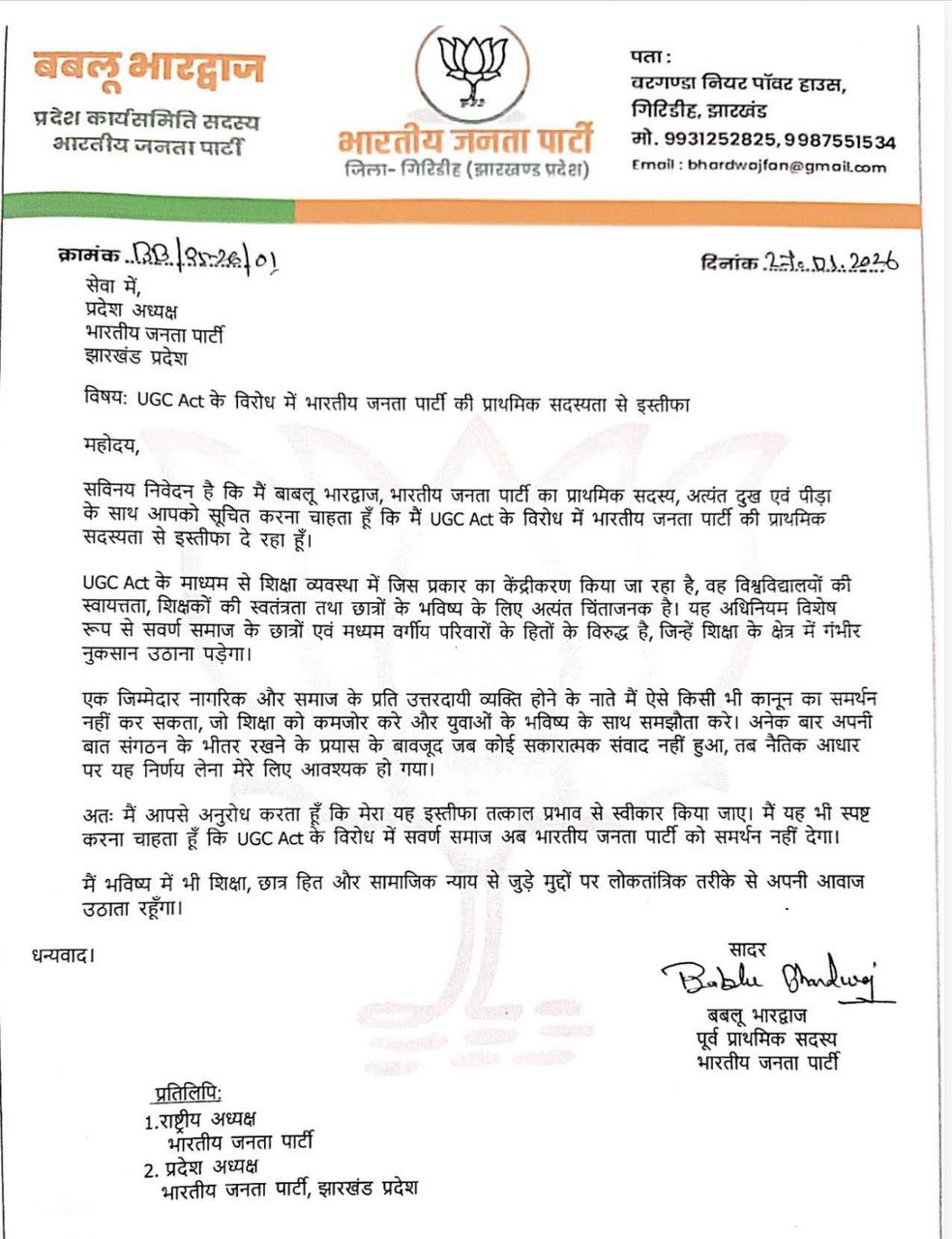 गिरिडीह. देश में नये यूजीसी एक्ट को लेकर लगातार विरोध – प्रदर्शन हो रहा है. इसमें भाजपा के भी कई बड़े नेता इस एक्ट का विरोध कर रहे हैं. इसी कड़ी के आज गिरिडीह में भी भाजपा के एक नेता ने भाजपा से इस्तीफ़ा दे दिया है. भाजपा प्रदेश कार्य समिति सदस्य बबलू भारद्वाज ने राष्ट्रीय अध्यक्ष व प्रदेश अध्यक्ष के नाम अपना इस्तीफ़ा पत्र भेज कर पार्टी की प्राथमिक सदस्यता से इस्तीफ़ा दे दिया है.