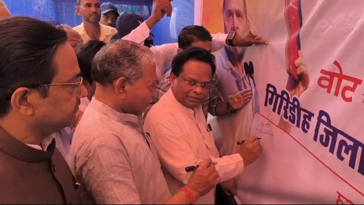 गिरिडीह. कांग्रेस की गिरिडीह जिला इकाई ने केंद्र सरकार के खिलाफ ज़ोरदार ‘वोट चोर, गद्दी छोड़’ हस्ताक्षर अभियान चलाया। इस अभियान में पार्टी के कार्यकर्ताओं और स्थानीय लोगों ने बढ़-चढ़कर हिस्सा लिया और सरकार की नीतियों के प्रति अपना विरोध दर्ज कराया।