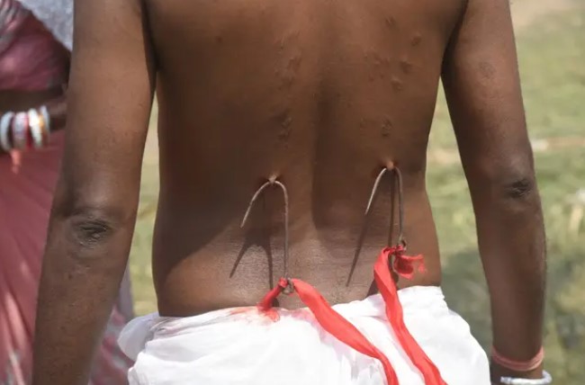 कठिन साधना: मिथुन लोहार और महेश लोहार जैसे ‘भोक्ताओं’ ने अपनी पीठ में लोहे की नुकीली कीलें (हुक) चुभवाईं।