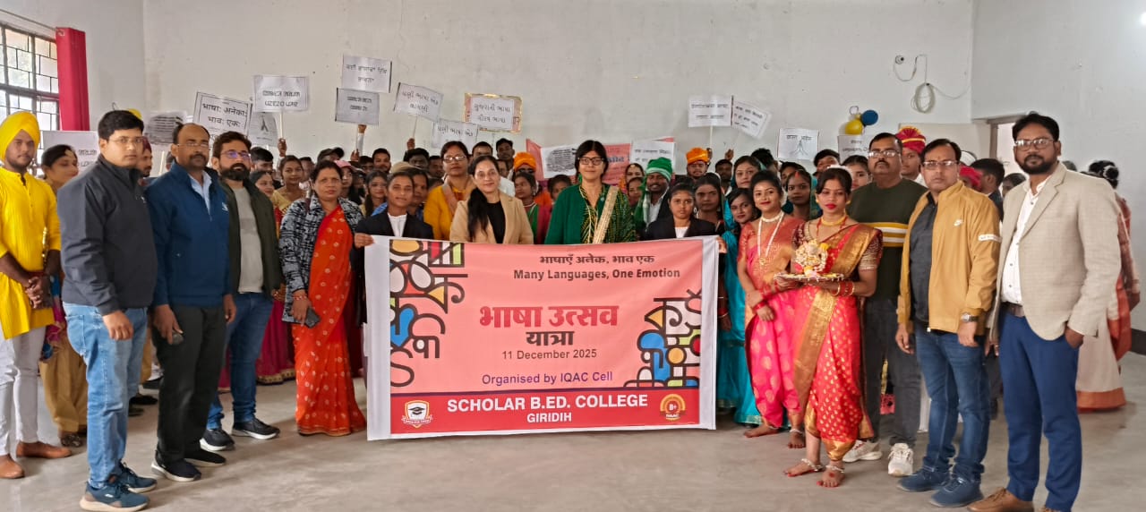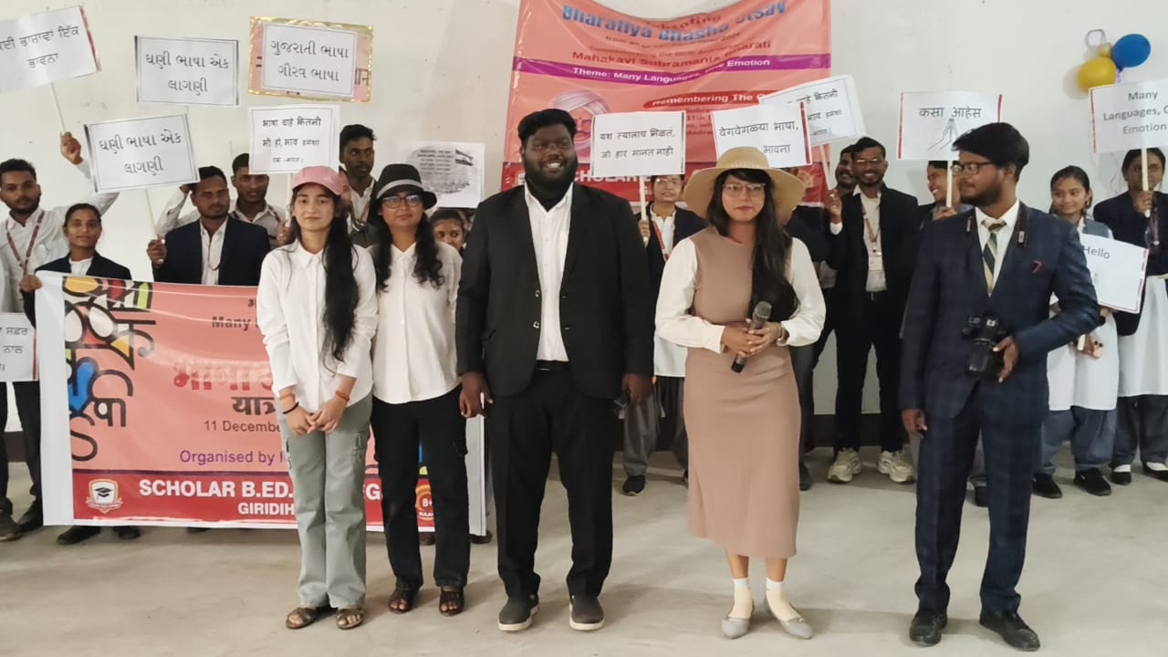 गिरिडीह. बनहत्ती स्थित स्कॉलर B.Ed कॉलेज में महाकवि सुब्रमण्यम भारती के जन्म दिवस के अवसर में प्राचार्या डॉ शालिनी खोवला के दिशा निर्देश पर भाषा उत्सव यात्रा निकाला गया जिसका शीर्षक था-“भाषा अनेक, भाव एक”।एक भारत श्रेष्ठ भारत की संकल्प को लेकर कॉलेज प्रशिक्षुओं ने अलग-अलग परिधान धारण कर इस कार्यक्रम को साकार किया।