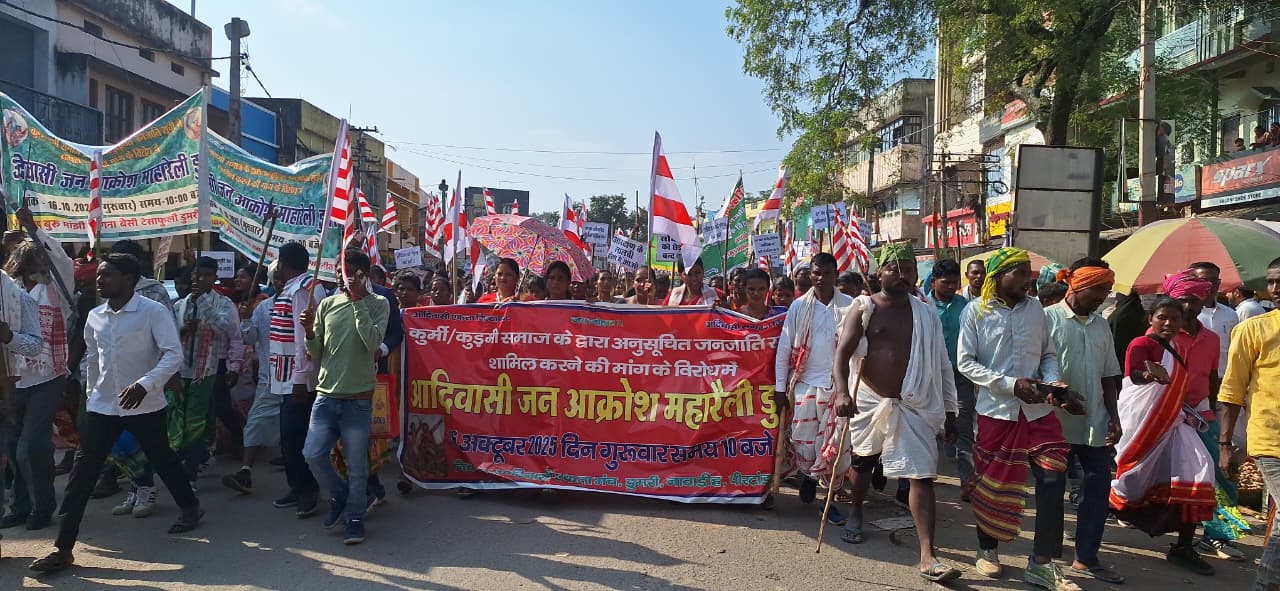 गिरिडीह. गिरिडीह जिले के डुमरी में आदिवासी समाज के लोगों के द्वारा आज एक जन आक्रोश रैली निकाला गया जिसमें कुडमी समुदाय द्वारा आदिवासी सूची में शामिल करने की मांग का पुरजोर विरोध किया गया. इस रैली में डुमरी प्रखंड एवं पीरटांड़ प्रखंड के विभिन्न आदिवासी गांव से सैकड़ों की संख्या में आदिवासी समाज के महिला-पुरुष व वृद्ध पारंपरिक हथियार को लेकर जुलूस में शामिल हुए. जुलूस की शुरुआत डुमरी के केबी हाई स्कूल के मैदान से शुरू हुई जो इसरी बाजार का भ्रमण करते हुए पुनः डुमरी केबी हाई स्कूल मैदान में पहुंचकर सभा में तब्दील हो गई जहां निशा भगत, सिकंदर हेम्ब्रम समेत अन्य आदिवासी नेताओं ने अपनी अपनी बातों को रखते हुए कुड़मी समुदाय द्वारा आदिवासी सूची में शामिल करने की मांग का पुरजोर विरोध किया. जुलूस के दौरान आदिवासी समाज के लोगों ने डुमरी विधायक जयराम महतो एवं आजसू सुप्रीमो सुदेश महतो का पूरजोर विरोध किया. सिकंदर हेंब्रम ने कहा कि महतो मांझी एकजुटता की नारा देने वाले आज कुर्सी में बैठे हुए हैं जबकि कानूनी तौर पर कुडमी जाति की इस मांग को केंद्र सरकार ने 2024 में ही खारिज कर दिया है उन्होंने कहा कि महतो और मांझी की लड़ाई में निहत्थे लोग सड़क पर उतर रहे हैं जो बिल्कुल गलत है. इसलिए मुख्यमंत्री हेमंत सोरेन को चाहिए कि दोनों समुदाय के प्रमुख लोगों को बैठा कर संवैधानिक रूप से लड़ाई लड़ने की अपील करना चाहिए परंतु अपनी राजनीतिक रोटी सेकने के लिए मुख्यमंत्री हेमंत सोरेन चुपचाप हैं इससे साफ पता चलता है कि मुख्यमंत्री हेमंत सोरेन आदिवासी समाज को ठगने का काम कर रहे हैं. इस दौरान आदिवासी नेता निशा भगत ने कहा कि आदिवासी इस देश का मूल नागरिक है. जहां आदिवासी समाज लगातार देश के लिए अपनी बलिदानी दी है. आदिवासियों की हकमारी बर्दाश्त नहीं की जाएगी. उन्होंने अपने संबोधन में कहा कि 1871 में मुगलों एवं अंग्रेजों के साथ आदिवासी लड़ाई की थी, उस समय कुड़मी समाज के लोग कहां थे, आज कुड़मी समाज आरक्षित सीटों पर सेंधमारी करने के लिए सरकार से अपनी मांग कर रही है. इसको लेकर उन्होंने कुड़मी समाज को आदिवासी सूची में शामिल करने की मांग के विरोध में जन आक्रोश महारैली का आयोजन किया गया. इसके अलावा निशा भगत ने झारखंड में लगातार आदिवासी मुख्यमंत्री होने के बावजूद झारखंड में सीएनटी एसपीटी एक्ट उल्लंघन हो रहा है इसको लेकर भी उन्होंने विरोध जताया है.