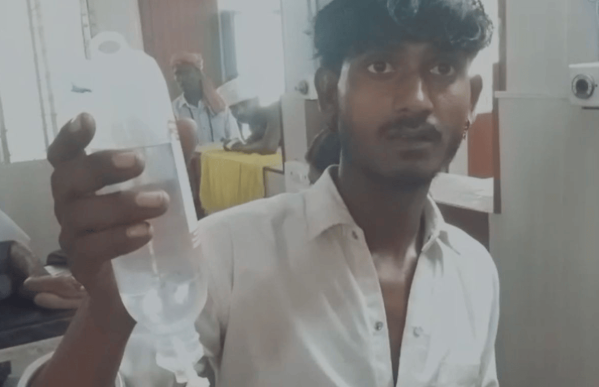 हाथ में पकड़ी बोतल: अस्पताल में स्लाइन स्टैंड उपलब्ध नहीं था। मजबूरन परिजनों को खुद ही हाथ में बोतल लेकर घंटों खड़ा रहना पड़ा।